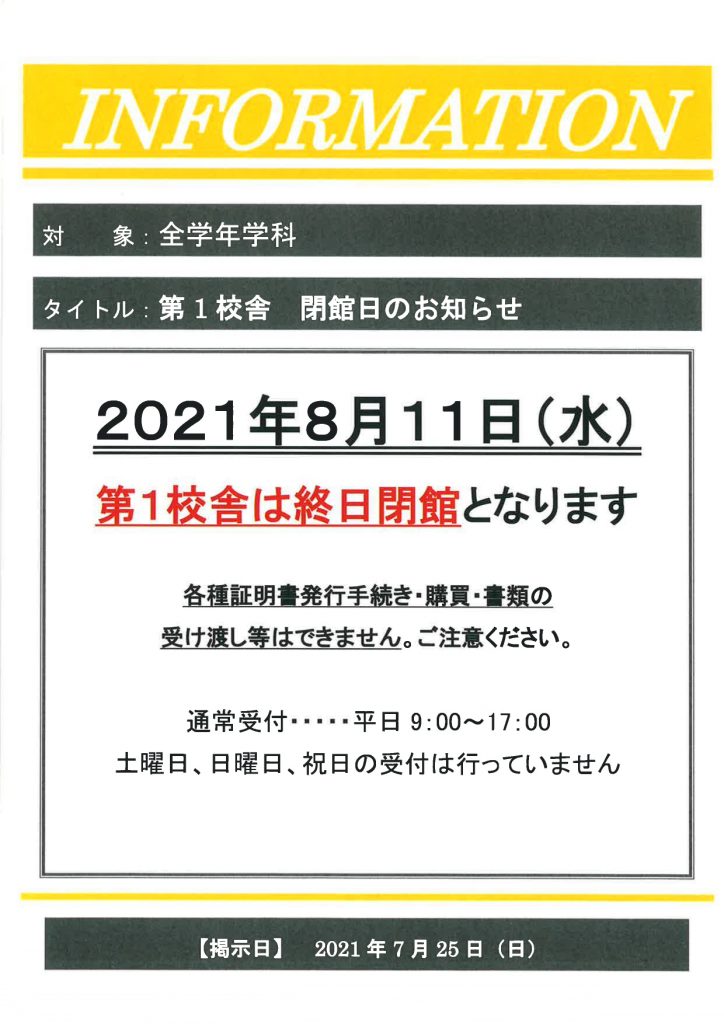 News News 28 Jul 2021 【在校生の皆様へ】第1校舎 閉館日のお知らせ 【受験生の皆様へ】オープンキャパスや学校説明会について ※2022年6月9日更新 一覧 【受験生の方へ】資料の発送についてのご案内 一覧 【受験生の皆様へ】オープンキャパスや学校説明会について ※2022年6月9日更新 【受験生の方へ】資料の発送についてのご案内