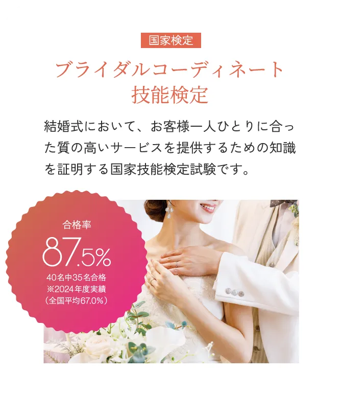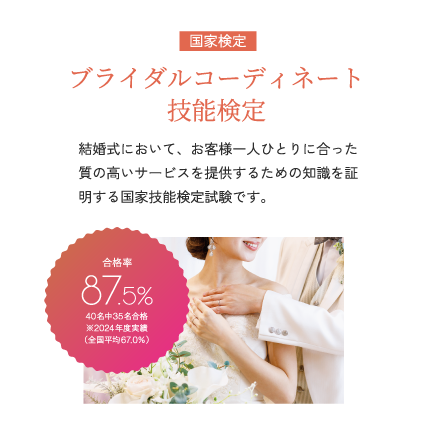 ウェディングプランナーとして知識・技能・実践力を習得し、国家検定3級、2級の取得を目指します。