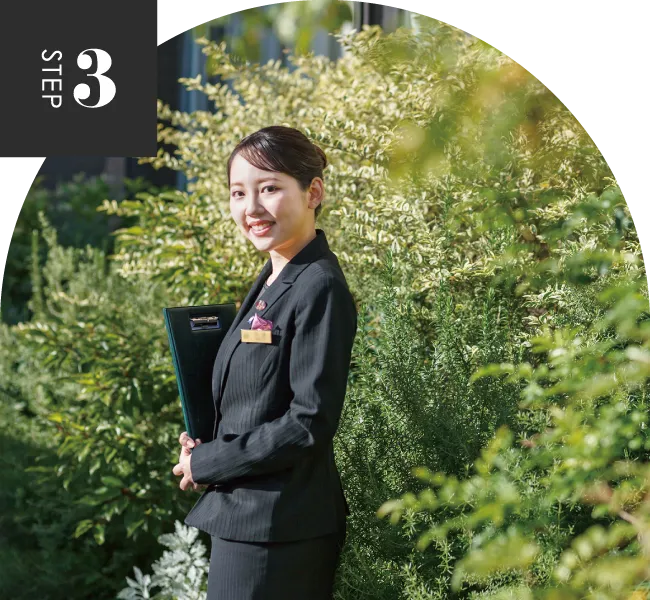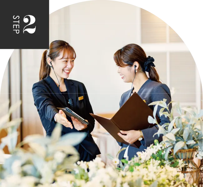 カップルとの打合せを挙式当日まで担当します。挙式・披露宴に関わる全ての提案・調整・手配を行い、カップルの夢を叶えます。