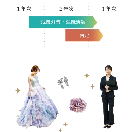ウェディングプランナー科で学ぶ3年間、余裕を持って「ブライダルコーディネート技能検定2級」の取得を目指せます。