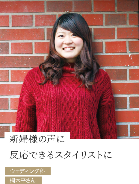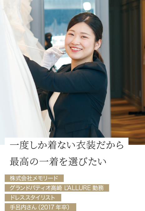 就職実績:高見株式会社TAKAMI BRIDAL/茂木商事株式会社 innocently/株式会社リブラブラフ/株式会社曽我/株式会社 ブライダルハウス チュチュ/株式会社メモリード/モリノブライズ株式会社/株式会社ベスト - アニバーサリー/メアリーウェディング株式会社/株式会社ウェディングボックス/アイ・ケイ・ケイホールディングス株式会社/株式会社ジョイフル恵利/株式会社ノバレーゼ/株式会社丸三屋 ブライダリウム ミュー/株式会社やまとアニバーサリー/株式会社長沼/みやび株式会社/株式会社三松 他多数