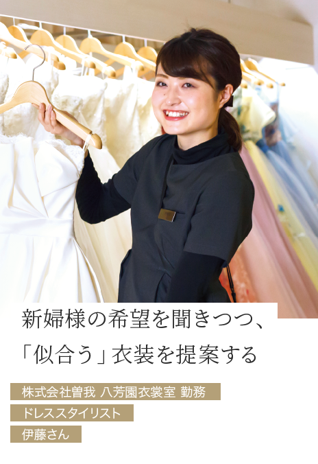ドレススタイリストは、ドレスショップや衣装室などで活躍しています。半数以上の学生が、実習提携企業に内定を決めています。