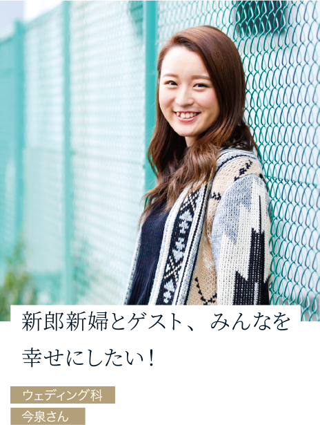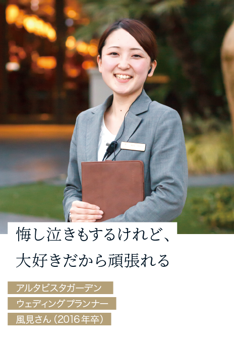 就職実績:ワタベウェディング株式会社/株式会社テイクアンドギヴ・ニーズ/株式会社ベストブライダル/株式会社BP/株式会社エスクリ/明治記念館/セレス高田馬場/アルタビスタガーデン/株式会社ポジティブドリームパーソンズ/ドーモ株式会社/株式会社リビエラ/株式会社C・B・H/株式会社プリオレストラン&ウエディングス/アルファクラブ武蔵野株式会社/株式会社Bria/株式会社CRAZY/株式会社ダイヤモンド・ノット(乃木會館)/株式会社ブラス/アイ・ケイ・ケイホールディングス株式会社/株式会社日本セレモニー 他多数