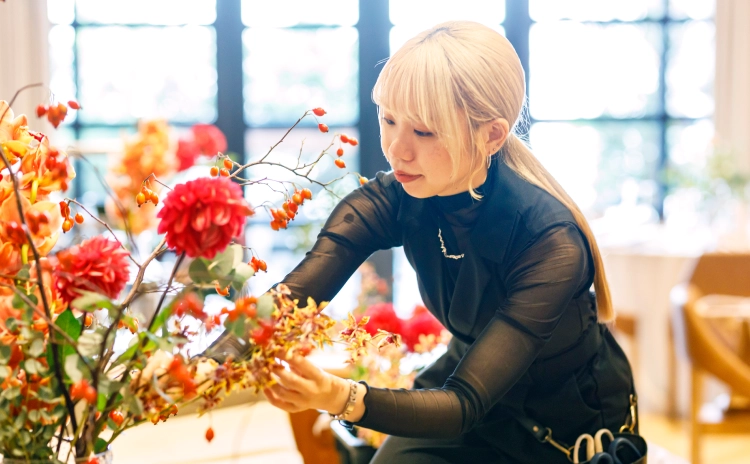 - 幼い頃にドラマを見てウェディング業界を目指しました。プランナー希望でしたが、2年生の実習期間でTRUNK(HOTEL)に来て、フローリストさんたちがすごくかっこいいなと思ったことが理由です。お花は専門職ですし、学校でも勉強しなかったので難しいことも想定していたのですが、面接の時に誘っていただいたことでフローリストになることができました。